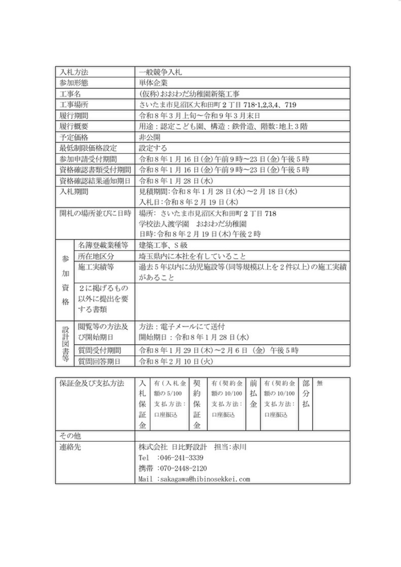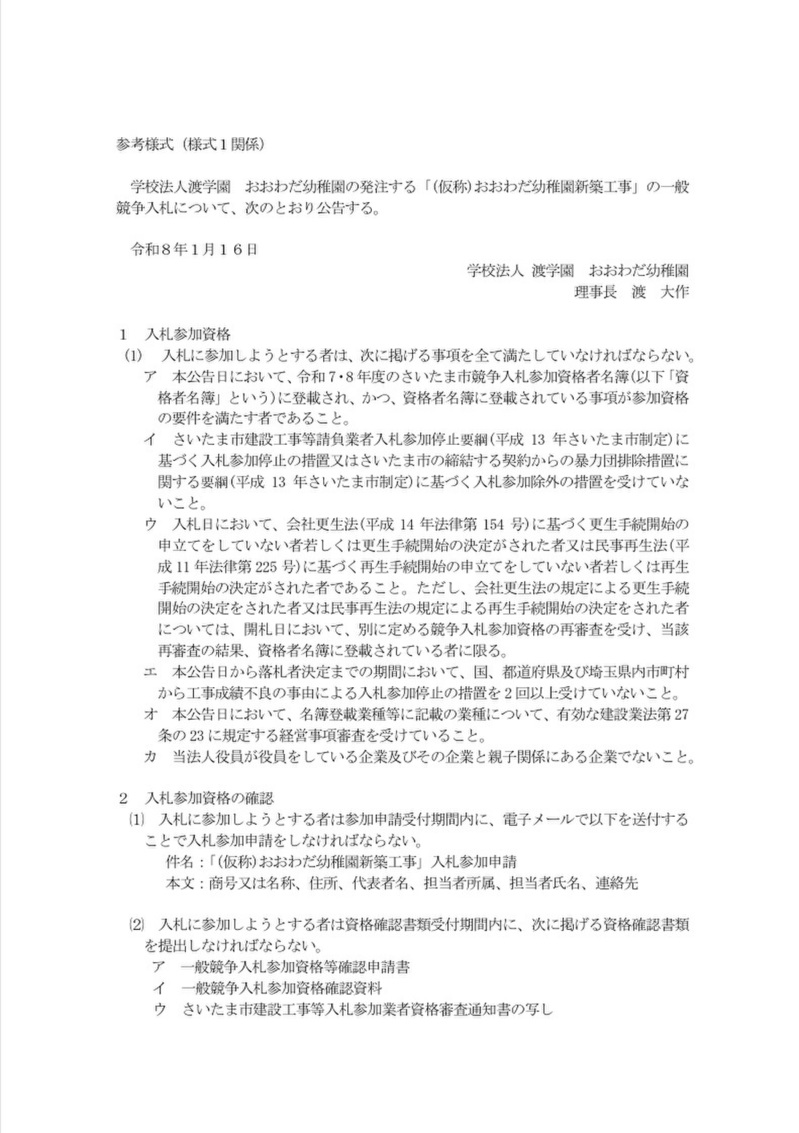 おおわだ幼稚園新築工事一般競争入札いて